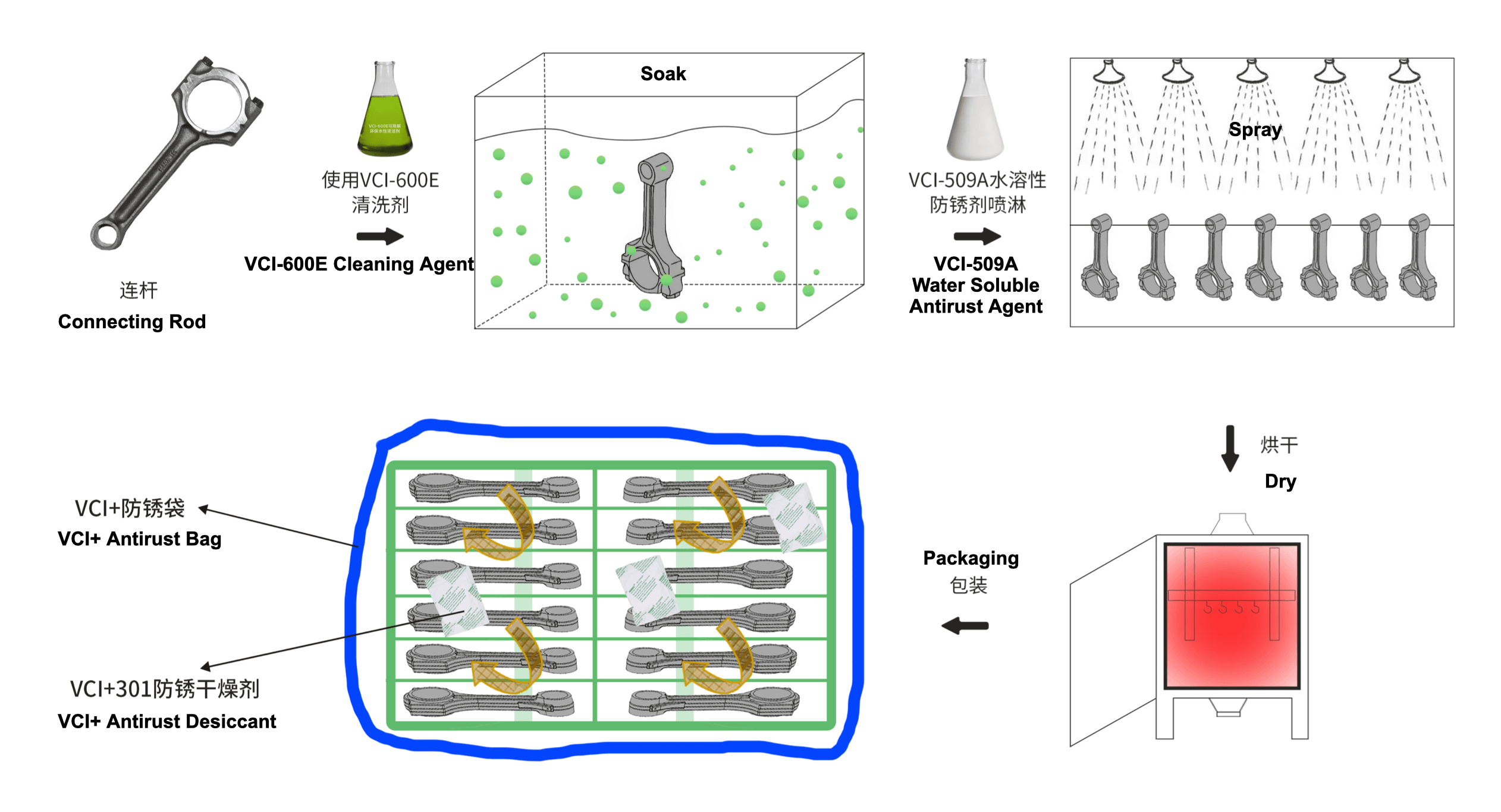 2.Utilisez l'agent antirouille soluble dans l'eau VCI-509A en remplacement de l'huile antirut, améliorant ainsi la reconnaissance des informations sur le produit.
