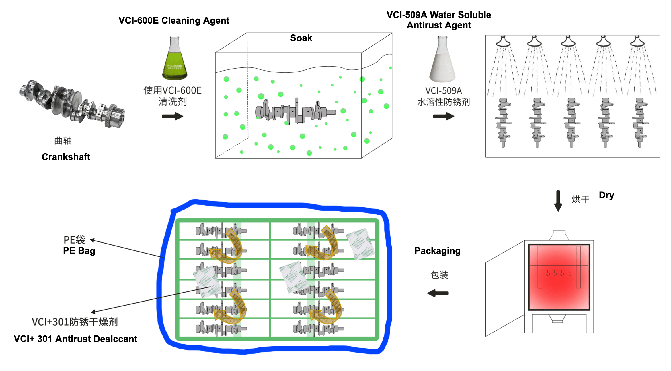 4. Mettez les déshydratants antirouille VCI-301 dans des sacs PE de vilebrequin.