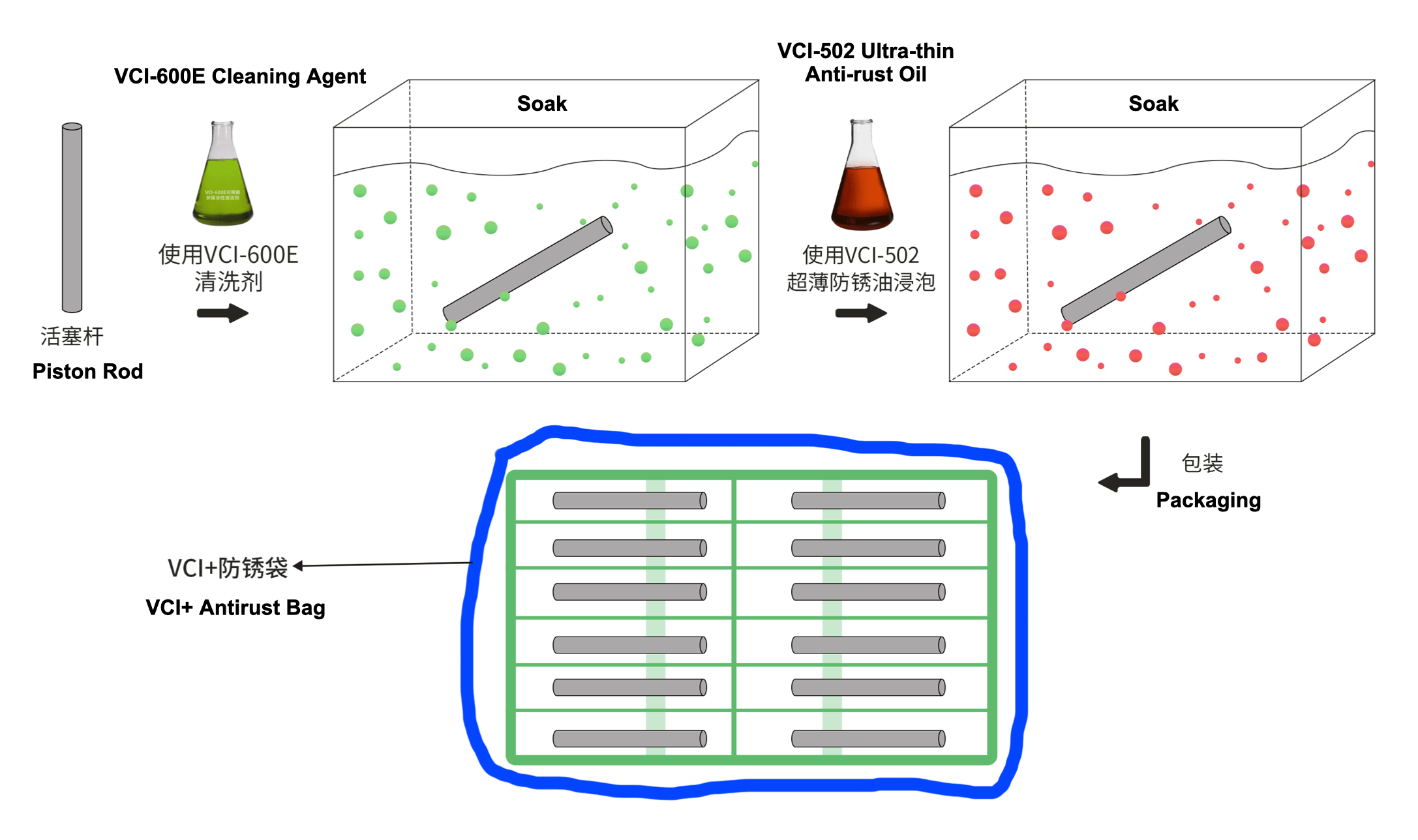 3. Utilisez de l'huile antirouille ultra-fine VCI-502 pour éviter la rouille sur la surface de la tige de piston, réduire le temps de séchage en surface et améliorer l'efficacité.